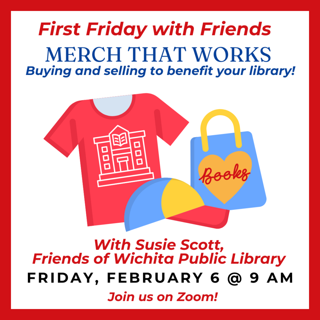 Is your Friends group thinking of another way to support your library? We have a great First Friday with Friends lined up for February as Susie Scott (Friends of Wichita Public Library) leads a discussion on successes and pitfalls of starting merchandising. Ideation, ordering, distribution, sales, inventory and more will be discussed. Bring your ideas and questions to share! See you on Zoom on Friday, February 6 at 9AM Central: https://us02web.zoom.us/j/88484969231